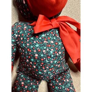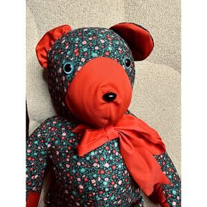 This vintage Keepsake floral handmade bear is in good used condition, with no stains or rips. This unique bear is a delightful addition to any collection or a charming gift for someone special. Its handmade nature adds to its character and appeal. The bear features a lovely floral pattern with green and red accents.