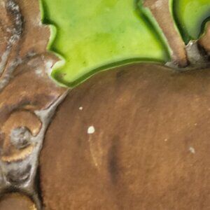 This vibrant green ceramic bread tray is crafted in the USA by Treasure Craft. It features a charming apple and grape design, adding a rustic touch to your table. Ideal for showcasing breads, rolls, or biscuits while enhancing your decor. A functional, collectible piece.