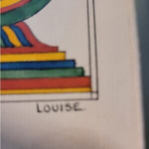Vibrant hand-signed vintage “God the Father’s Hand” prayer artwork by Louise, featuring ornate Pennsylvania Dutch folk art florals and calligraphy in vivid red, blue, green, and yellow tones. The blessing reads: