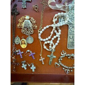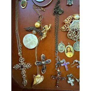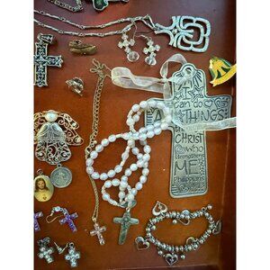 A versatile collection of religious-themed jewelry, featuring crosses, medals, charms, and rosary beads. Mixed metals with intricate designs ideal for collectors.