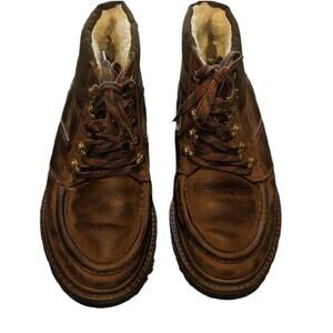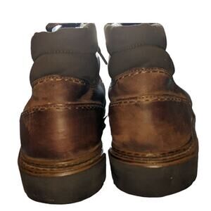 Step up your footwear game with these classic German-made Salamander chukka boots. Crafted from rich brown leather with a durable, vintage finish, these boots feature eye-catching multi-tone laces and quality brass hardware. The cozy wool shearling lining ensures superior comfort and warmth, making these boots perfect for colder months.