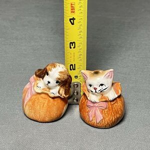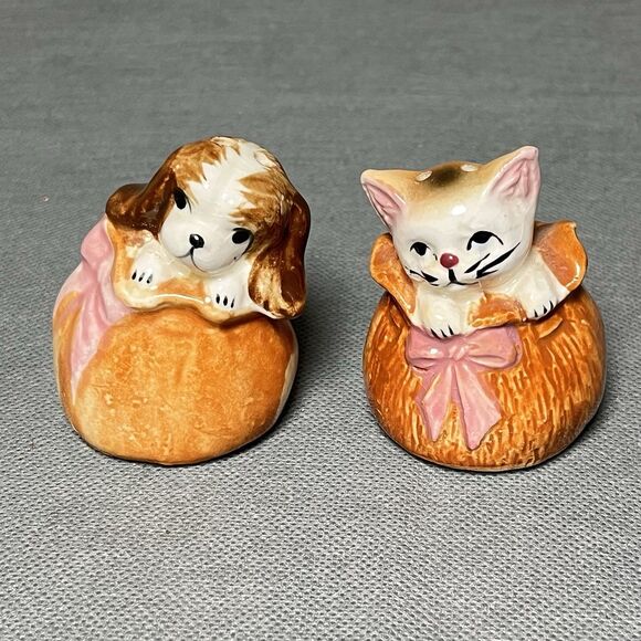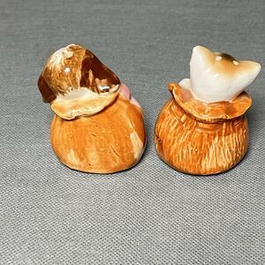Vntg Salt & Pepper Shakers Cat and Dog in Sack Shaker Set-Anthropomorphic-Kitsch