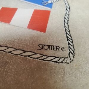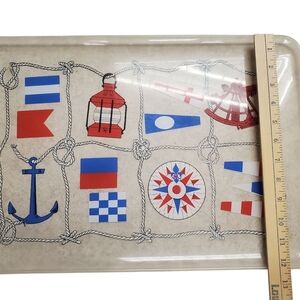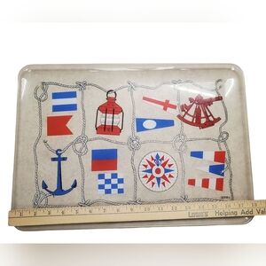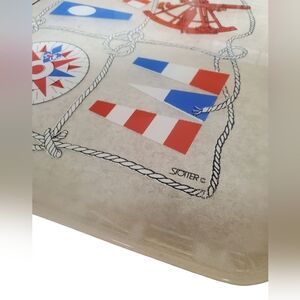 Nautical tray with rope design and flag motif. Features red, blue, and white colors.
