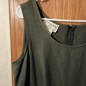 Classic vintage Karin Stevens Petites dress in a forest-green textured check pattern. The soft polyester–rayon blend drapes smoothly, giving the dress that clean late-90s sheath silhouette perfect for office wear, career outfits, church events, or quietlux minimalist styling. The midi-to-maxi length flatters petites while maintaining a structured, polished look.