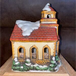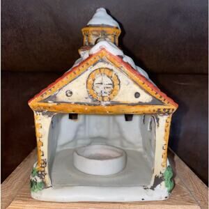 Vntge Lefton Hand-Painted Porcelain Church Snow Tree Fence Tea light candeholder