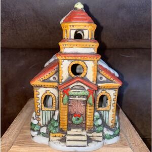 Lefton Hand-Painted Porcelain Church Snow Trees Antiqued Tea light Holder. No chips or cracks! Detail is so beautiful and excellent quality 1986 6” tall x 4 1/2” x 4” made in Sri Lanka