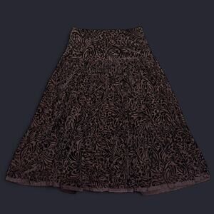 Vocabulary dark brown and black whimsy velvet burnout tiered a-line silk blend midi skirt - Size 6/Small/X-Small, see measurements below!