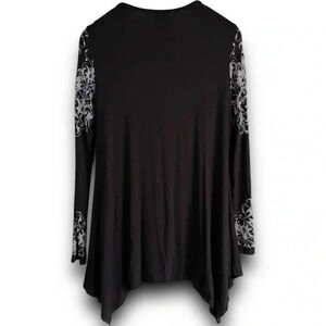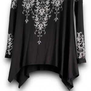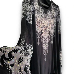 Solid black iconic ‘Vocal’ embellished crystal stones gem beaded graphic print tunic long sleeve top featuring asymmetrical trim in size medium. Excellent pre owned condition.