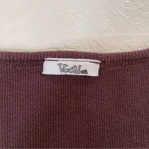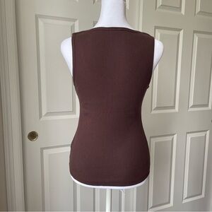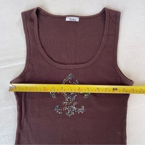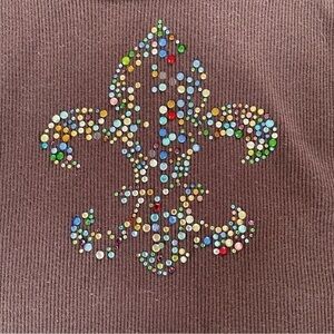 Vocal brown ribbed tank top with multi-colored rhinestones in a Fleur De Lis design. Top is in very good condition, but a few of the rhinestones have come off. They are heat pressed onto the fabric, not sewn on. Dry cleaning or hand washing is recommended. Measurements are taken flat - see photos. Fabric has quite a bit of stretch to it.
