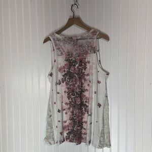 This Vocal tank top blends boho romanticism with soft glam details. A semi-sheer burnout style tank with pink rose floral print down the front, rhinestone accents, and lace side/back paneling.