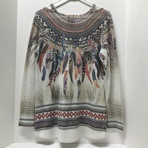 Vocal Watercolor Feather Aztec Print Cold Shoulder Long Sleeve Knit Sweater