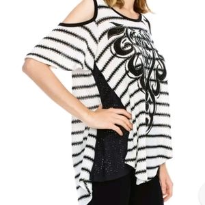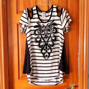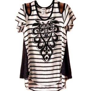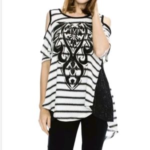 Stunning Lightweight tunic top by Vocal. Cream and black. Sides are studded. Graphic swirl is also studded. Striped. Peekaboo cold shoulders. Size Large. Approx 31.5in length, bust 21.5in. Lots of stretch and super soft.