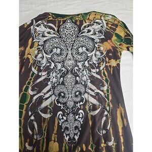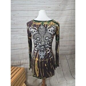 Vocal women's size small long sleeve tunic length top. Fleur-De-Lis graphic with rhinestone embellishments. Brown, green, and tan background colors.