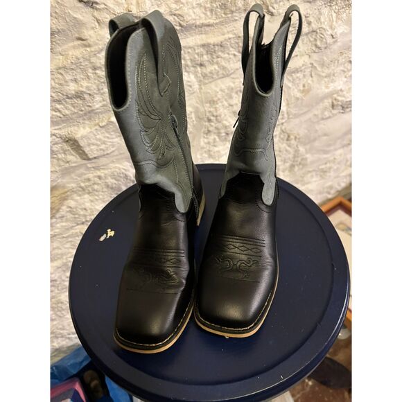 Black and blue Western boots with detailed stitching, side zippers. Kids size 4. Gently used, condition is great. 1" heel | 9" shaft | finger loops to pull on boots.