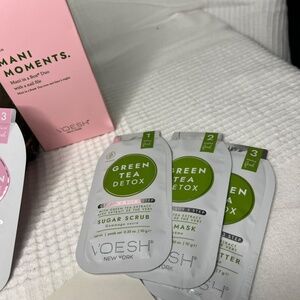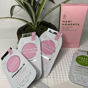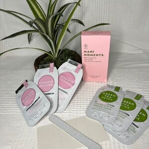 Green Tea Detox and Vitamin Recharge 3 Step systems, plus a nail file. Each of these manicure kits contains a sugar scrub to gently exfoliate dead skin, a cream mask to condition and smooth skin, and a massage butter to soften and hydrate skin