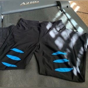A great pair of workout pants made by Vogo Athletica. The pants are black with turquoise strips that look like cutouts in the pants. The workout pants are soft and stretchy and look great on. They are a size medium. Perfect for your next workout or just to run errands in.