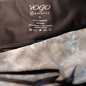 The Vogo Athletica leggings in black with a multi color waist band, size small, are designed for women who enjoy a blend of athleisure and sports styles. Made from a blend of polyester and spandex, these Capri-length leggings feature moisture-wicking and breathable properties, making them perfect for both workouts and casual everyday wear. The unique design of the waistband adds a pop of color and style to these versatile leggings from the brand Vogo. Inseam 20 in rise 11 in