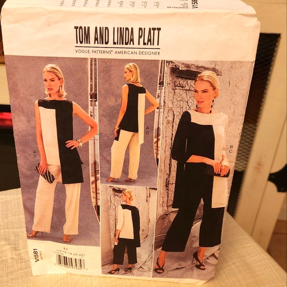 Sewing pattern number V1581 from Vogue American Designer Tom and Linda Platt. Size 14 16 18 20 22. Includes a tunic with contrast variations and uneven hem. Wide leg trousers with concealed back zip and in length variations. Uncut.