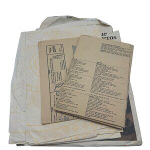 Envelope shows creasing, discoloration, and small tears along edges. Contents appear intact and include all pattern pieces and instructions. Measurements: Pattern size = One Size.