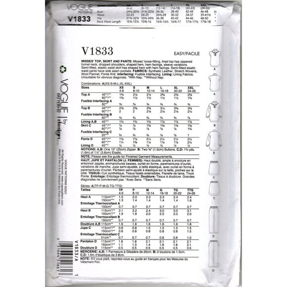 This Vogue Patterns V1833 offers a sophisticated sewing pattern to craft a versatile ensemble, including a loose-fitting top, a chic skirt, and tailored pants. Intended for the fashion-forward individual, this pattern provides an opportunity to explore your creativity and wardrobe potential while ensuring style and comfort through its thoughtful design.