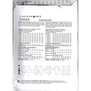 Vogue V9335 is an uncut sewing pattern designed for women's sizes 6 to 14. This pattern set includes a stylish tunic and pants, making it a versatile addition to your sewing collection. Created by Vogue Patterns, it brings high-fashion design to home sewing.