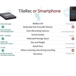 Practical, Portable & Efficient. TileRec is much more than just the slimmest mini MP3 voice recorder. Measuring in at a staggering 1.6 inch in length, and 1/4 inch in height, weighing only 0.5 oz nothing else on the market comes close to the efficient portability offered by TileRec. Record the entire day then just plug & play all your recordings. Unique and Reliable Design We designed the world’s thinnest Voice Activated Recorder just to be sure that it will fit anywhere and anytime in your daily routine. The TileRec Dictaphone fits easily in your wallet, your pocket or purse so you can use it any time you need to record important sounds in your life. The shock resistant aluminum case brings preace of mind knowing that you can drop it or step on it but the TileRec will keep capturing audio for the entire day. Easy Operation With Voice-Activated Recording Imagine how you’d feel if you had one chance to get something on tape...but you forgot to press ‘record’... You’ll never have this problem with this voice-activated recorder. It will automatically turn on and start recording when it hears a conversation happening (roughly 45dB). Audio can be captured clearly up to 50 feet away.