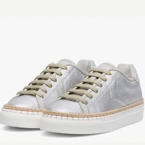 Silver coated jute sneakers with calfskin profiles and braided jute edge.