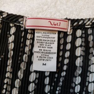 Vol. 1 does it again with this low maintenance, high fashion 3/4 sleeve, mini pleated blouse. Wrap front v-neck with empire waistband. Fabric pattern looks like you've been draped in silver and gray pearls on a black background! So chic! Glam it up with accessories and heels, or just be hip and wear with some black skinny jeans and flats! 100% Polyester ensures easy care and no wrinkles! Great for travel! EUC