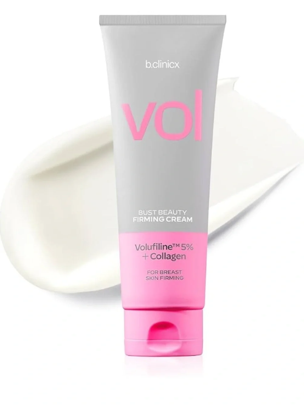 Vol Bust Beauty Firming Cream with Volufiline™ 5% + Collagen. Targets breast skin firmness and helps improve skin elasticity. Lightweight, fast-absorbing formula for daily use. Presented in a pink and gray tube for easy application.
