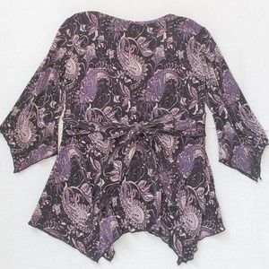 Flowing and fashionable, from the mini pleated fabric to the detailed ruching on the sides of the empire waist band and from the neckline to the shoulder, this blouse is a beauty! Plenty of give due to the pleating! Wrap v neck with handkerchief hem on bottom as well as edge of 3/4 sleeves. Ties in back. Great for travel as it won't wrinkle and can be hand washed and hung to dry! 100% Polyester EUC