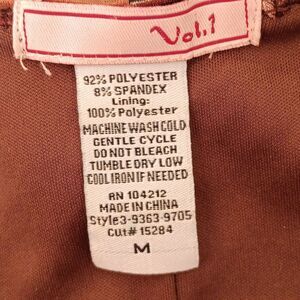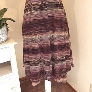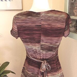 Beautiful stylish brown striped garment by Vol. 1. Semi-sheer textured fabric. Fully lined. Sheer sleeves. Wrap bodice. Wide ruched waistband. Handkerchief hem. Size M measures 36 at chest, 28 at waist, 42 at hips, 37-42 long from shoulder to hem. Perfect for any occasion.