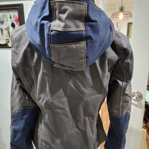 Jacket is slim fitted with angular seam lines, the details on the removable hood calls back to the character’s helmets, and that arm cannon sleeve zipper will certainly be a conversation starter. Dark blue, grey with yellow zippers. Fully lined with light blue fabric.