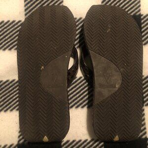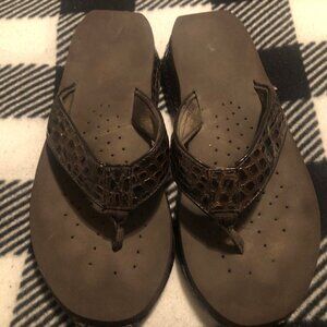 Elevate your style with these trendy wedge sandals from Volatile. The brown faux croc skin adds a touch of sophistication to any outfit, while the comfortable thong style and wedge heel make them perfect for any occasion. These sandals are a must-have for any fashion-forward woman and are available in size 8. The Volatile brand is known for its quality and attention to detail, making these sandals a great addition to your collection. Whether you're dressing up or down, these sandals are sure to turn heads.
