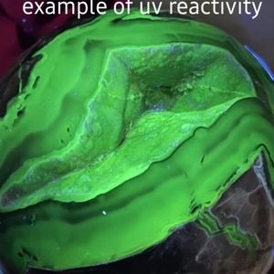 This fairly new material has been named "Volcano Agate," which is a captivating stone with a fiery secret. Made from a unique UV-reactive agate, this sphere shows an earthy appearance in daylight. However, under a longwave UV light, this agate glows with an intense, bright green luminescence.