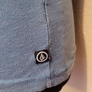 This is a blue Volcolm t-shirt with layered cursive "Volcolm" in different shades of blue and white.