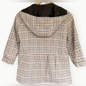 Volcom 3/4 Sleeve Button Up Button Front Brown Plaid Hooded Coat with Gathered Cuffs. Jacket. Outerwear. Pockets. Hood.
