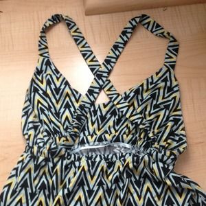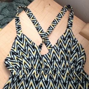 Volcom Babydoll Top! Never worn! does not fit me well. Has a criss crossed back; baby blue, yellow, and black designs all around the shirt! Good shirt for the beach, or with a nice pair of jeans and sandals! It is a size XS but I feel like it fits like a Small.