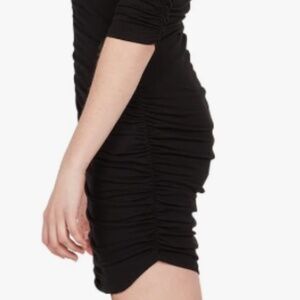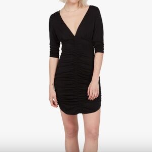 Beautiful black dress for formals, date night, or graduation. Bodycon mini dress with 3/4 length sleeves. Seaming at chest cups and flattering shirring detail at center front body and side seams. Metal badge at back neck.