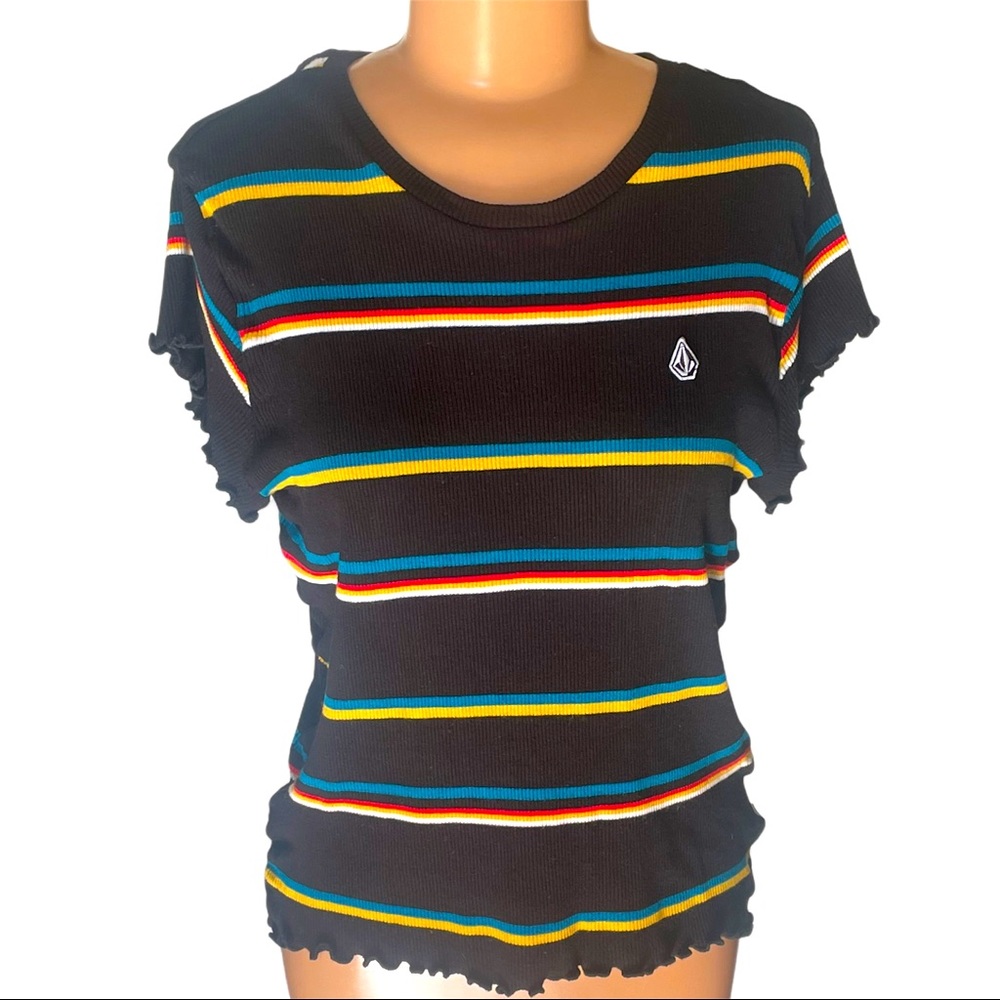 A super cute short sleeve with adorable ruffled edge sleeves, this soft black tee is made of viscose/elastane blend, ribbed allover for a nice stretch and fit. This slightly cropped too features yellow, blue, red, and white horizontal stripes. The Volcom logo pistol patch is a stylish little touch. This comfy tee is finished with a lettuce ruffle sleeve, and hem. Size 12, Medium. Approx. lay flat measurements: Pit to pit 18” un-stretched, shoulder to hem 21.5”. Excellent preowned condition.