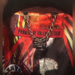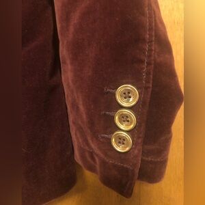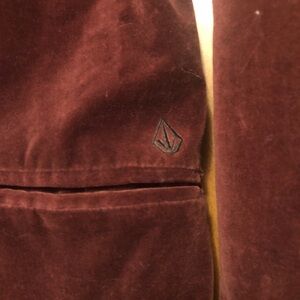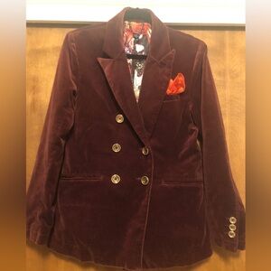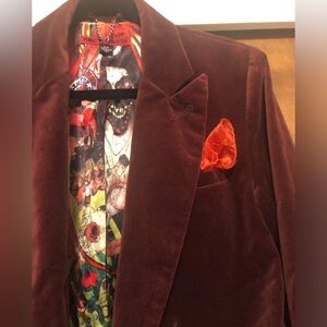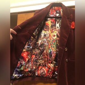 Vintage Volcom burgundy wine velvet double breasted blazer with gold buttons and orange kerchief accent. Inside lined with cool design. Size small.