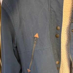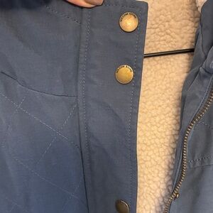 Volcom jacket in blue. Features cozy cream Sherpa lining. Perfect for warmth and style. EUC. This coat will last forever. Very heavy and warm. Two large front pockets with snaps. Two smaller zip pockets. Slit detail on the bottom of the back side. Cinch ties at the bottom and also on the inside at the waist to really customize the fit. Quilted detailing at the top of the coat. I picked this up when I lived in Oregon. This thing will keep you very warm.