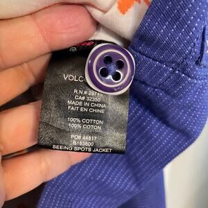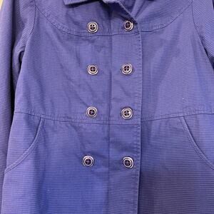 Volcom Blue & White Striped Double Breasted Collared Blazer size Medium. This Volcom brand jacket comes with a double-breasted button closure, featuring four buttons on each side. It has a collared neckline and long sleeves, with the Volcom diamond on the back shoulder and logo name in white lettering at the front corner.