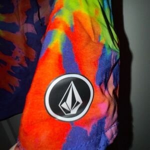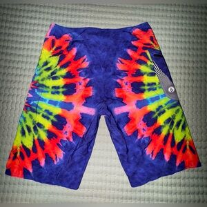 Vibrant tie-dye board shorts with a drawstring waist. Features a zipper up side pocket for convenience. Perfect for beach days. No mesh lining. Comfortable!!