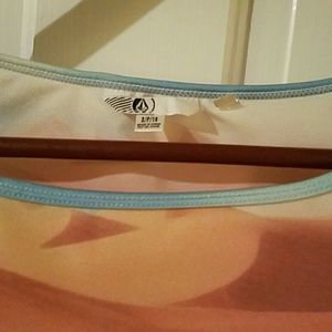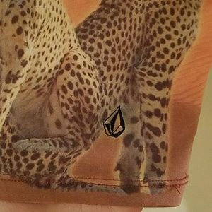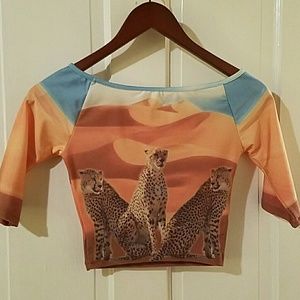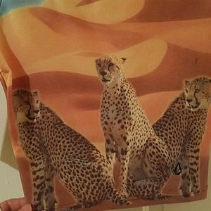 A super cute, high quality nylon spandex fabric featuring a Cheetah and desert print. Fabric has a slight sheen to it. Really lovely but too small for me. Worn once and it has two teeny tiny discolorations featured in last two photos.