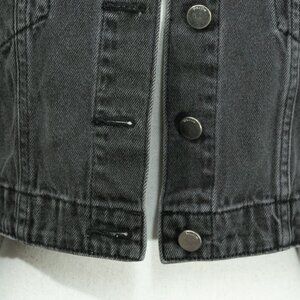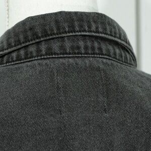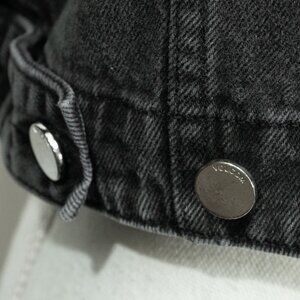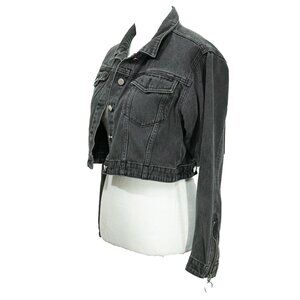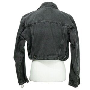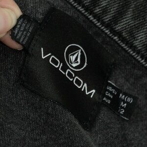 Volcom Crop N Block Denim Jacket Grey Black Boxy Retro 90s Skater Trucker Jacket, size Medium. This is cropped jean jacket that has a retro 80s or retro 90s style and is so skater. It is washed grey or faded black denim and could be considered goth. Might also work for Coastal Cowgirl or western country Opry outfits.