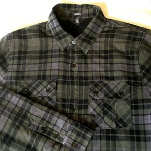 Volcom Flannel Shirt Jacket Sherpa Fleece Lined Plaid Gray L Snap Board Skater