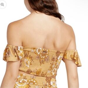 Chic crop top with floral pattern. Features ruffle sleeves. Ideal for casual outings.