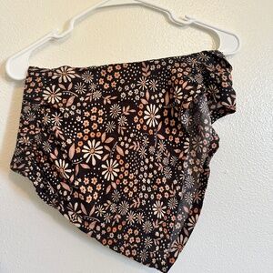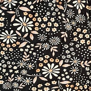 Black with tan, neutral, cream and orangish flower pattern. Cute, bohemian surfer shorts. Viscose material.