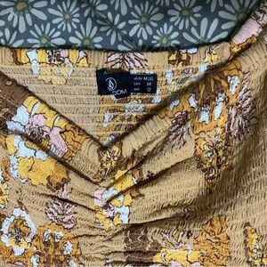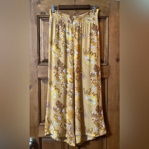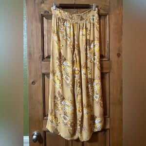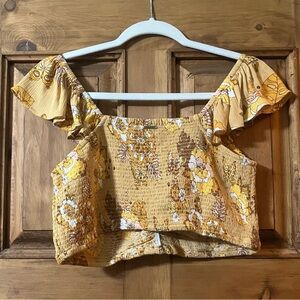 Cute mustard blouse with floral design and relaxed bottoms. Features smocked detailing and off the shoulder sleeves. Never worn, in perfect condition. Comes from smoke free home.