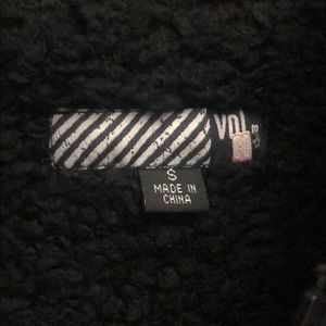 Black Volcom Jacket with cute details! Quilted with sweater knit details on the sides and end of sleeves. Lined with black faux Sherpa material for extra layer of warmth. Also has 3 patch details on front of jacket and pockets! Has been worn but in good condition no stains or rips.
